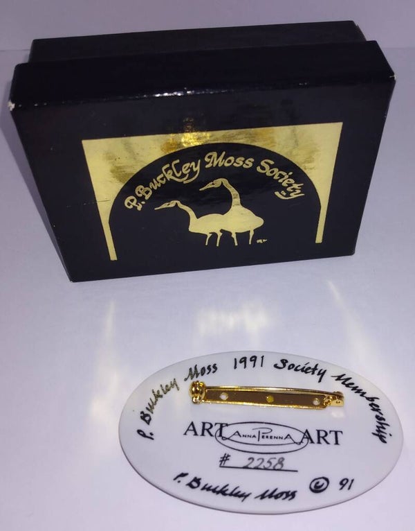 Created exclusively for 1991 P. Buckley Moss Society members, this collector’s pin is ideal for wearing, gifting, or adding to a treasured P. Buckley Moss pin collection. Its detailed design and historical significance make it a meaningful keepsake for art enthusiasts and collectors alike.
