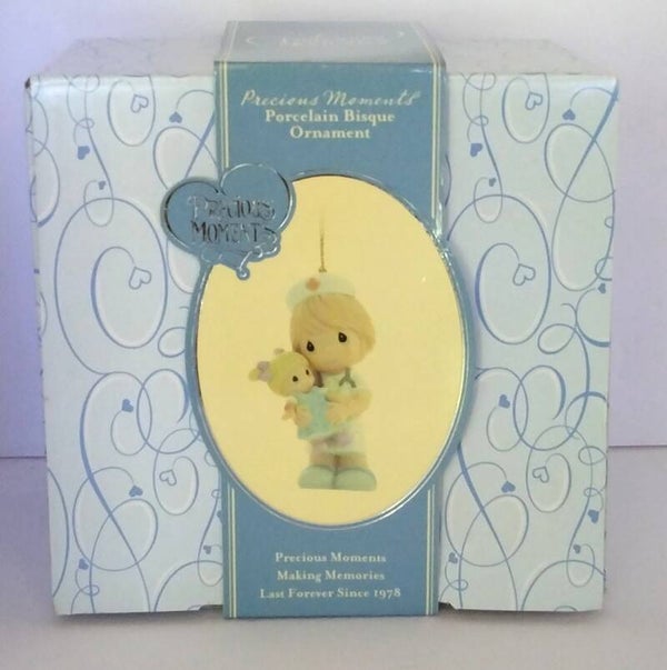 Created by Samuel J. Butcher, the founder and artist behind Precious Moments, this ornament embodies his vision of spreading messages of love, faith, and hope through simple, emotional artwork. Introduced as part of the 1980s–1990s Precious Moments collection, this piece quickly became a favorite among collectors, healthcare professionals, and anyone who appreciates acts of compassion.