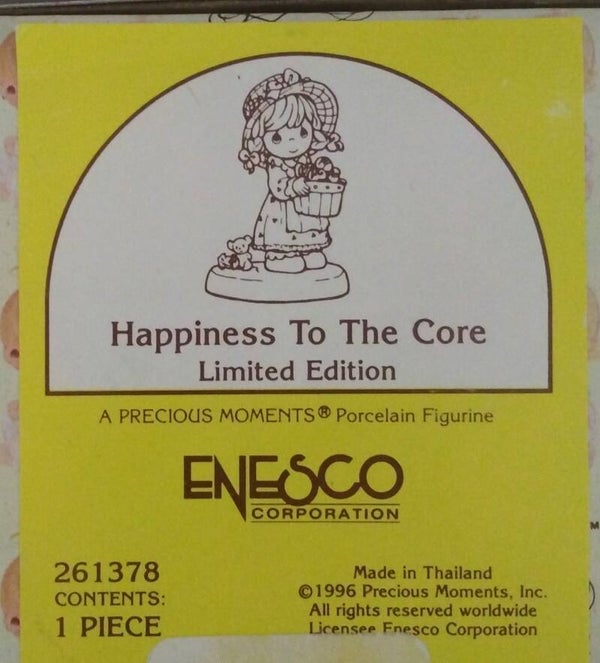 Created by Samuel J. Butcher, “Happiness to the Core” reflects the enduring mission of Precious Moments to inspire faith, love, and joy through meaningful art. Since the late 1970s, these figurines have become treasured keepsakes for collectors and thoughtful gifts for family and friends.