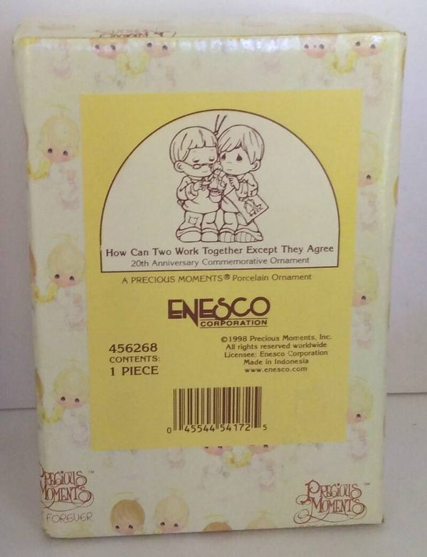 Celebrate unity, faith, and collaboration with the Precious Moments “How Can Two Work Together Except They Agree” ornament. This beautifully crafted collectible features two signature teardrop-eyed characters standing together in harmony, symbolizing the importance of agreement, teamwork, and shared faith. Hand-painted in soft pastel tones with delicate detailing, this ornament captures the tender artistry that has made Precious Moments beloved by collectors for decades.