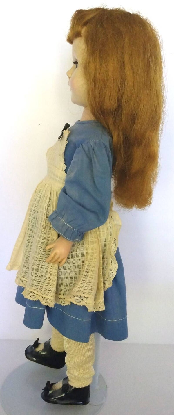 Perfect for vintage doll enthusiasts and 1950s toy collectors, this 18" Sweet Sue "Alice in Wonderland" doll with moveable eyes and stand preserves a classic piece of mid-20th-century American doll history.