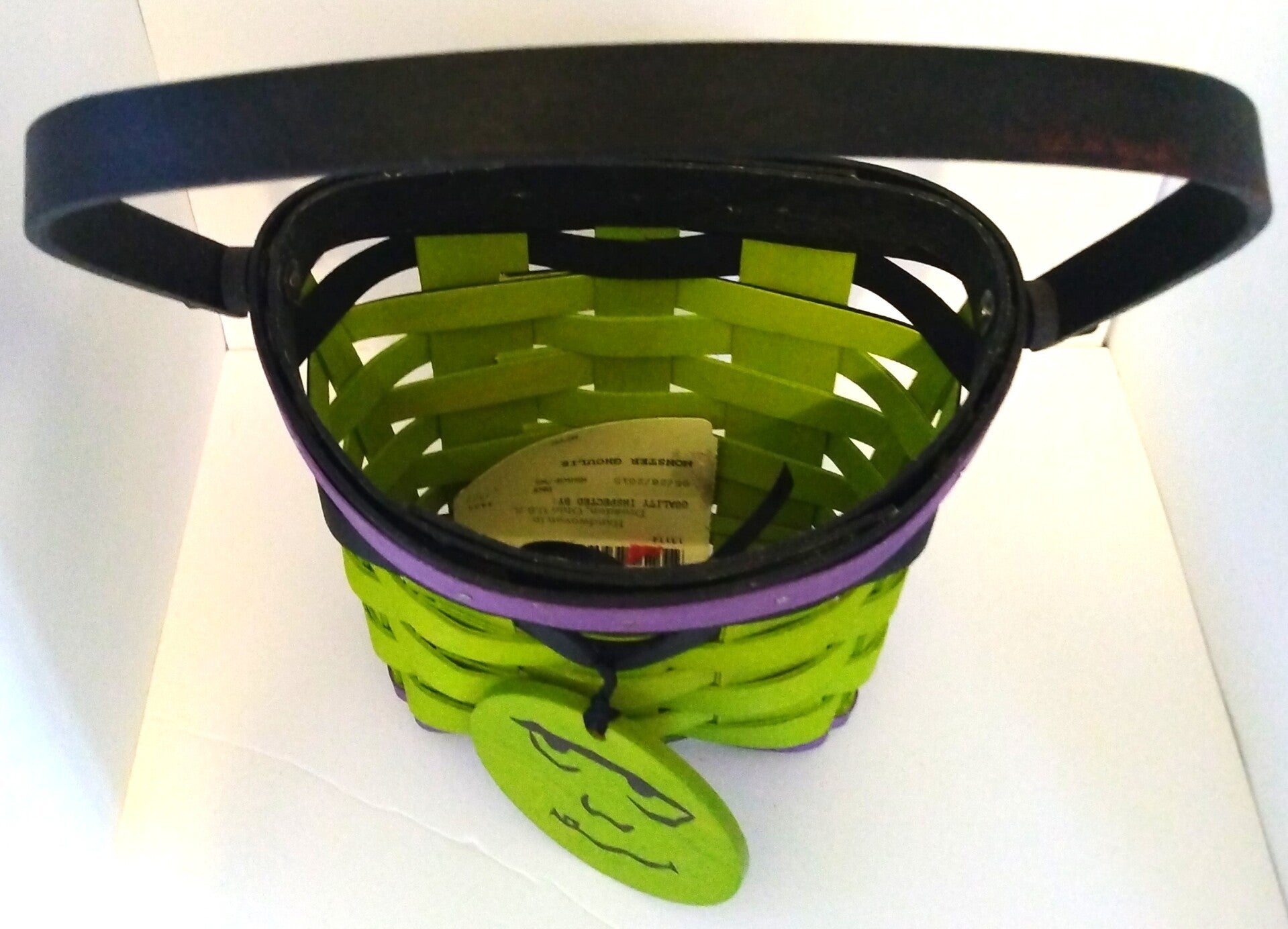 Bring spooky fun and handcrafted quality to your Halloween décor with the Longaberger 2010 Frankie Basket — a festive collectible that celebrates the creativity and craftsmanship of Longaberger’s seasonal designs. Handwoven from lime green, purple, and black maple splints, this basket features a charming Frankenstein face wooden tie-on that adds playful character and Halloween spirit.